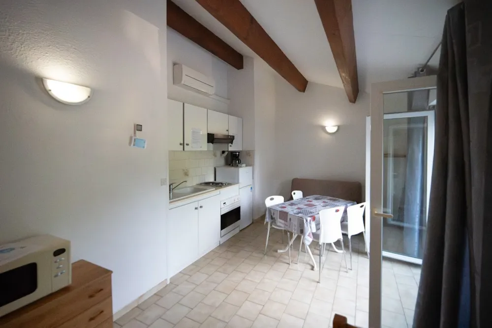 Appartement suffisamment grand pour 2, avec une petite terrasse. Il est idéalement situé à l'entrée du camping, près du parking.